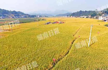 1010日,溆浦縣橫板橋鄉(xiāng)紅星村,超級(jí)雜交稻第四期畝產(chǎn)千公斤高產(chǎn)攻關(guān)示范基地滿(mǎn)眼金黃,一派豐收景象。記者 李健 攝