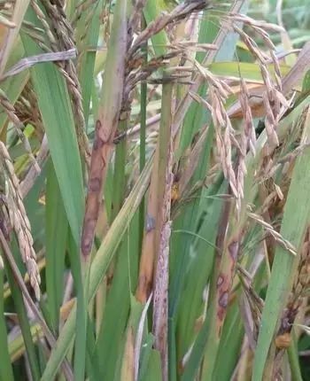 穗頸瘟:發(fā)生于主穗梗至第一枝梗分枝的穗頸部,初期形成褐色小點,后使穗頸部變褐,幼嫩的穗頸和穗軸受到病菌侵染后,輸導(dǎo)組織受害,養(yǎng)分和水分不能上輸,造成部分或全部白穗。