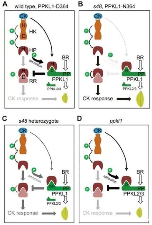 研究人員通過大規(guī)模誘變,篩選到一個大粒突變體s48并克隆了突變體基因PPKL1,發(fā)現(xiàn)其與之前報道的控制水稻籽粒大小的基因GL3.1在同一位點(diǎn)突變,但導(dǎo)致了氨基酸的不同變化。與RR蛋白類似,PPKL1可與AHP2蛋白直接互作,并且D364位點(diǎn)所在區(qū)域與RR蛋白的磷酸基團(tuán)接受域氨基酸組成和序列十分相似,然而D364并不能像RR蛋白一樣接收磷酸基團(tuán)。當(dāng)PPKL1-D364存在時,AHP2向RR21的磷酸中繼效率大幅降低,而D364突變后對磷酸中繼沒有影響,相應(yīng)地籽粒顯著增大。PPKL1-D364可能作為細(xì)胞分裂素信號的關(guān)鍵抑制子,避免水稻籽粒的過度發(fā)育。